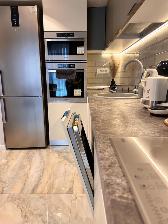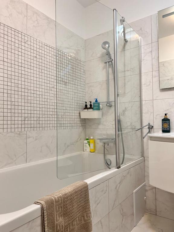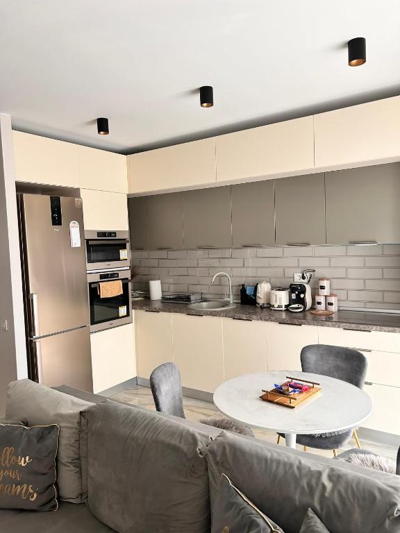 A modern ground-floor apartment featuring one bedroom, a cozy living room, and a fully equipped kitchen with free WiFi and a washing machine. Guests enjoy air conditioning, streaming services, and a workspace ideal for longer stays.